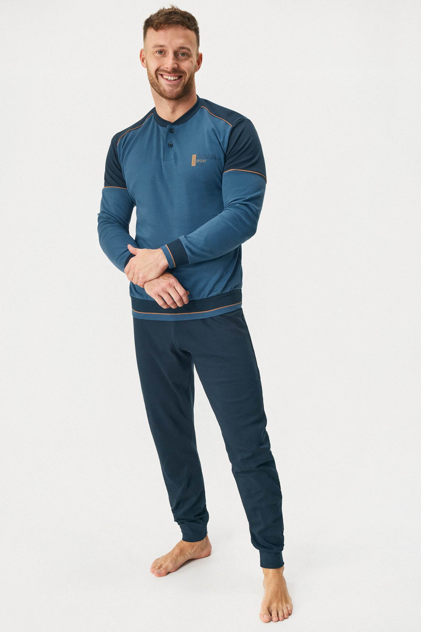 Bavlnené pyžamo Ethan je ušité z mäkkého úpletu pre vaše nočné pohodlie. Tričko s dlhými rukávmi zdobí výstrih na gombíky, dlhé nohavice majú gumu v páse. Okraje sú zakončené manžetami.