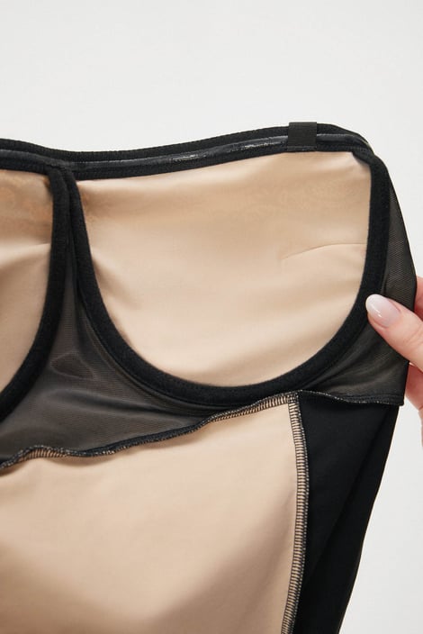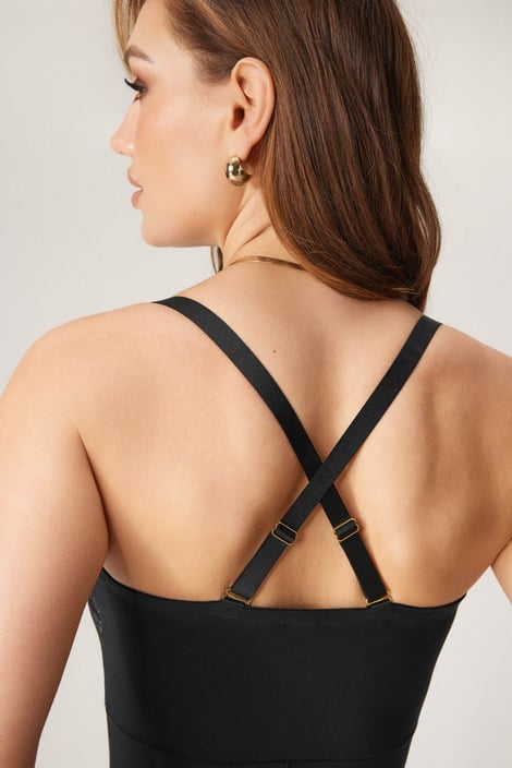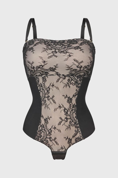 Body DIVA by IVA Lace Bandeau je unikátne body navrhnuté s Ivou Kubelkovou. Bandeau strih so všitými špeciálnymi kosticami prsia objíme a spevní, vytvorí plný dekolt a poskytne oporu aj veľkým prsiam. Má odopínateľné ramienka, využijete ho teda ako pod sako, tak pod asymetrické modely aj šaty s odhalenými ramenami. Silikónový pásik po celom obvode, vďaka ktorému body perfektne drží, vám dodá sebavedomie na celý deň. Čiernu farbu dopĺňa predný diel v telovej farbe potiahnutý kontrastnou čipkou. Navrhnuté špecialistami Astratexu.