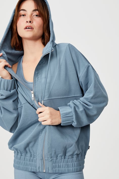 Dámska mikina Panelled z bavlneného modrého úpletu vám poskytne dokonalé pohodlie. Obľúbený strih s kapucňou a zapínaním na zips.