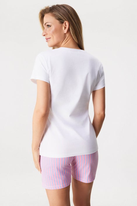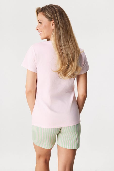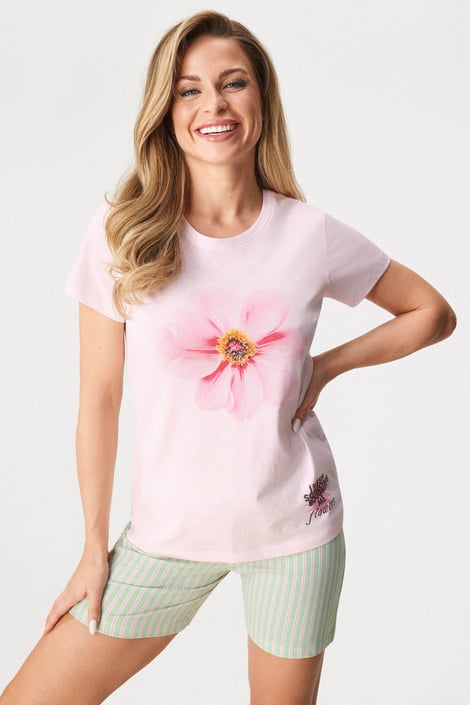 Dámske pyžamo Sabrina vám ponúkne mäkučké pohodlie bavlneného úpletu. Jednofarebné tričko s krátkymi rukávmi zdobí kvetinová potlač na prednej časti. K tomu šortky s jemným prúžkom, v páse do gumy.