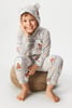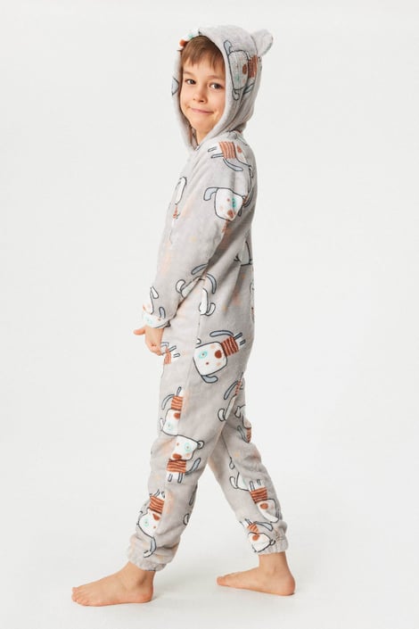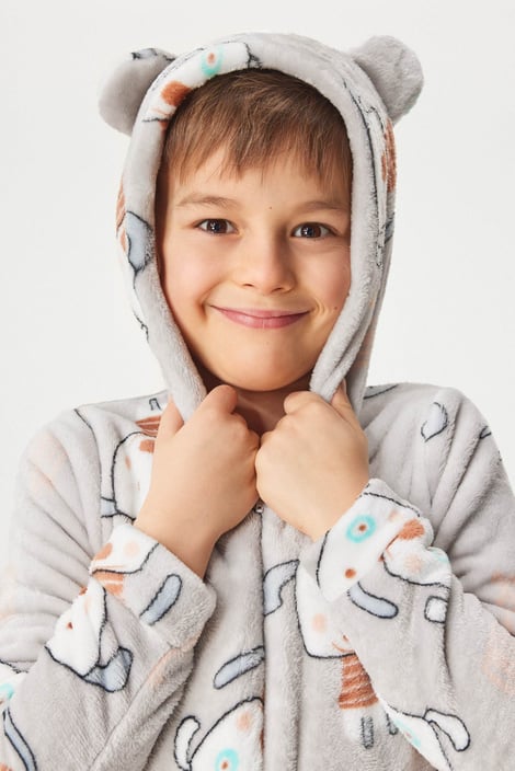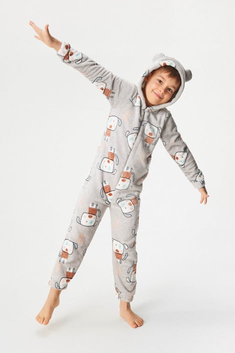 Detský hrejivý overal Kigurumi na zips. Mäkučký mikroplyš zdobí decentne farebná potlač. Na kapucni nájdete našité ušká. Ideálny na zababušenie.