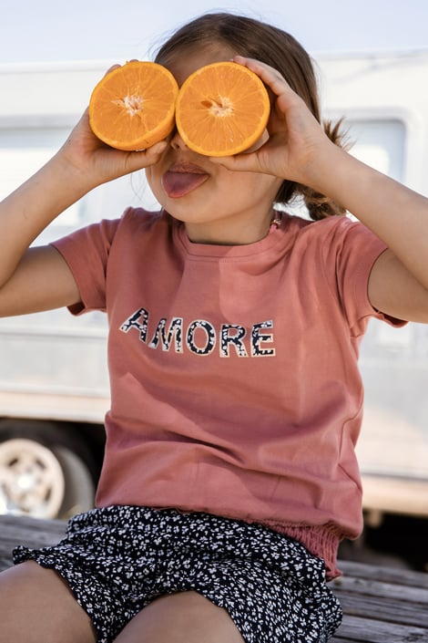 Dievčenské tričko Amore je ušité z príjemného úpletu a obľúbi si ho každý malá slečna. V spodnej časti riasená nesťahujúca guma s volánikmi. Vyrobené z udržateľných materiálov.