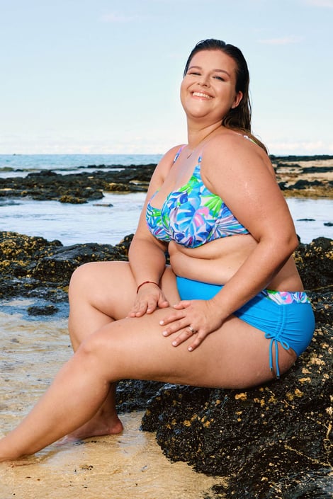Dvojdielne plavky Blue Mosaic sebavedome oblečú aj dámy plných tvarov. Podprsenka disponuje košíčkami s kosticami, ktoré sú mäkko vystužené a prsia tak krásne vytvarujú. Vyšší stred ich podrží presne tam, kde majú byť. Klasický strih nohavičiek so zvýšeným pásom diskrétne schová bruško, boky sú výškovo nastaviteľné. Blankytne modrú farbu v hladkom prevedení dopĺňa plavkové piké s tropickou potlačou. Špeciálny materiál je opatrený UV ochranou a navyše odoláva žmolkovaniu, chlóru a opaľovacím prostriedkom.