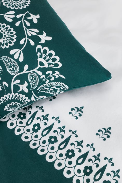 Obliečky Peisley sú očarujúce na pohľad a hrejivé na dotyk vďaka príjemnému flanelu. Zelený podklad zdobí honosný kašmírový vzor v bielej farbe.