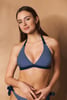 Horný diel dámskych plaviek Amy s modro-bielymi prúžkami. Trojuholníkové košíčky majú mäkučké vypchávky, ktoré jemne vytvarujú dekolt.