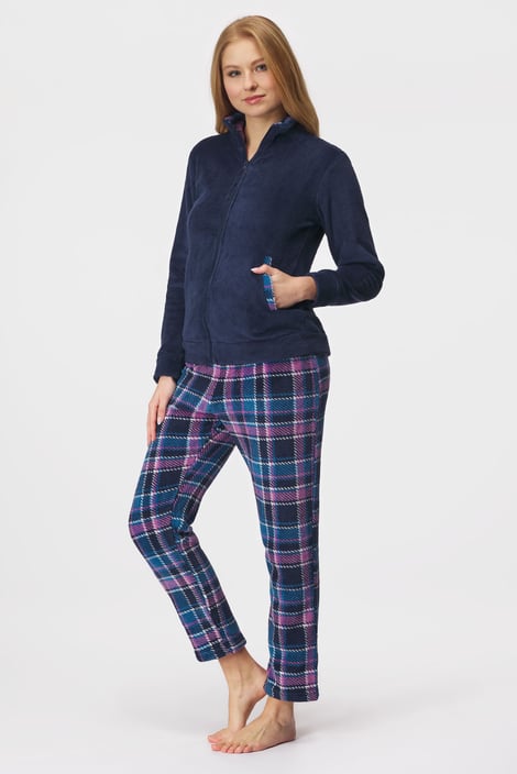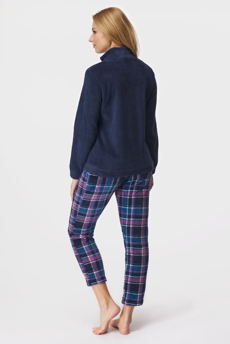 Hrejivý komplet Jessie z príjemného mikroplyšu je ideálnou voľbou do chladných mesiacov. Mikina má praktický stojačik a na bokoch vrecká. Dlhé nohavice zdobí obľúbený károvaný vzor.