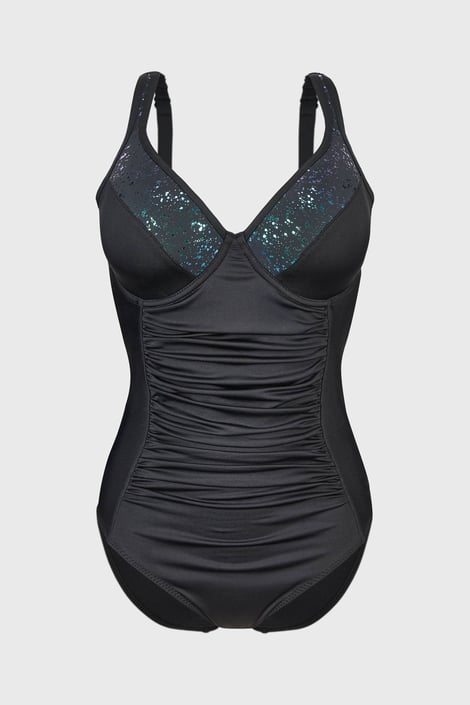 Jednodielne plavky Maia Moonlight sú ako stvorené pre skutočné dámy. Čierna silueta opticky zoštíhľuje, naberanie v prednej časti lichotí brušku. Mäkko vystužené košíčky s kosticami zdobí vo výstrihu krásne trblietavý dekor. Hlboký výstrih na chrbte zaistíte zapínaním, ramienka si dĺžkovo prispôsobíte. Hlavným benefitom tejto kolekcie je luxusný taliansky materiál, ktorý je nielen pevný a krásny, ale aj vyrobený ekologickou cestou z udržateľných zdrojov. Navrhnuté špecialistami Astratexu.