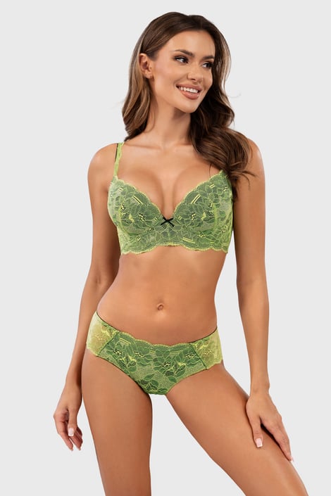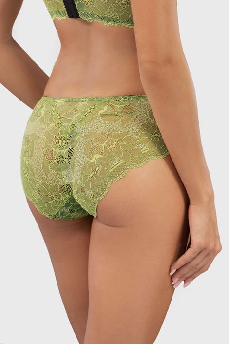 Klasické nohavičky Amalee v decentnom odtieni zelenej. Prednú časť zdobí nežná kvetinová výšivka, zadoček zakrýva ľahučká čipka.