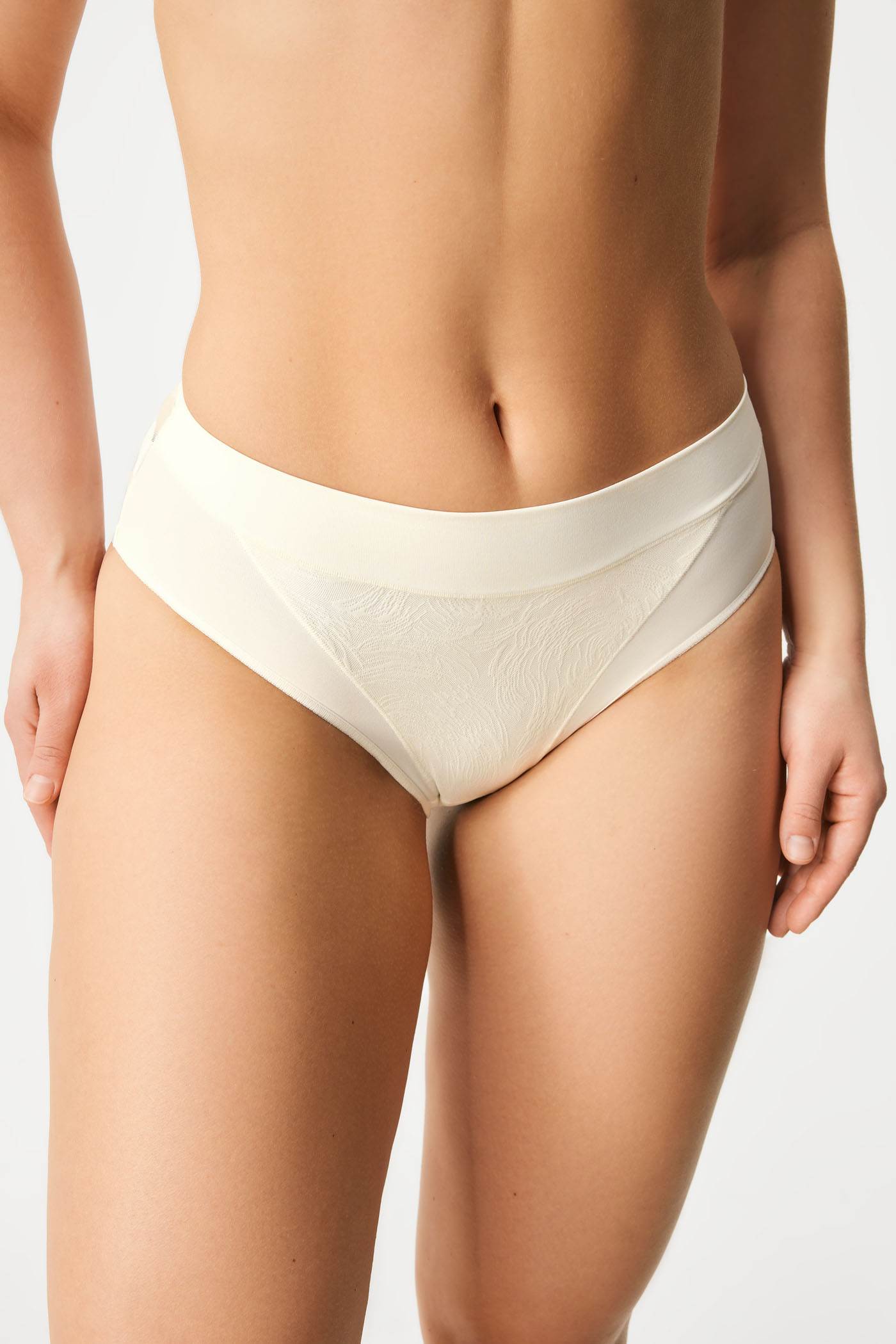Vyššie nohavičky Violeta oblečú plné krivky do zmyselnej elegancie. Na prednej strane vyniká jemná výšivka, zadná je z decentne priesvitnej sieťoviny.