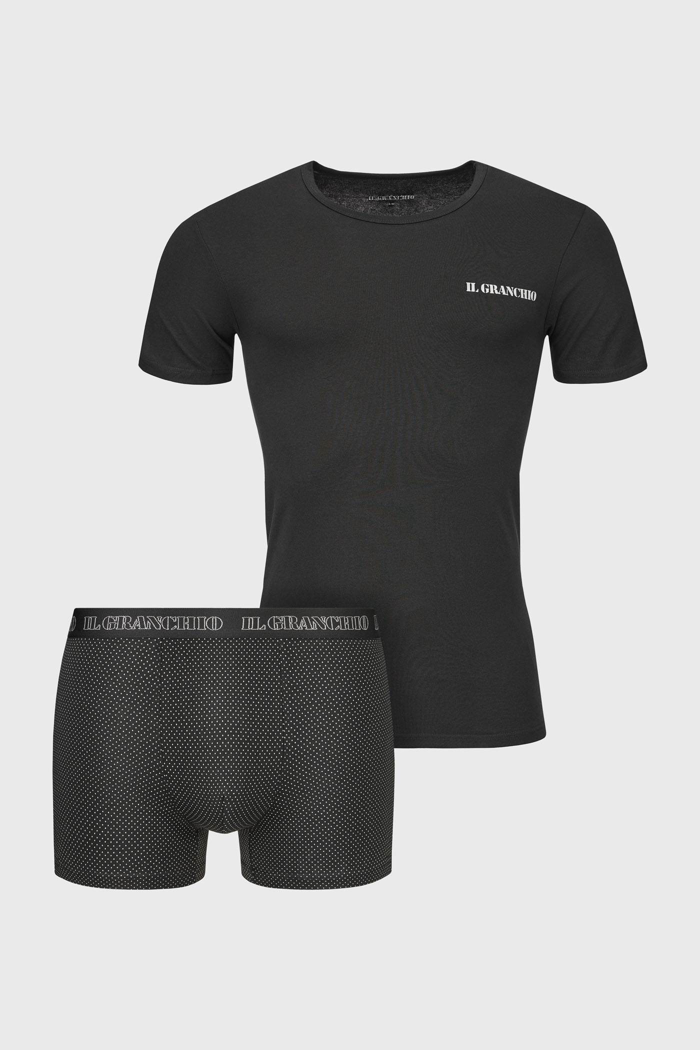 Bavlnené tričko a boxerky Roy v praktickom komplete. Jednofarebné tričko má malú potlač loga na prednej strane. Boxerky sú v dizajne drobných bodiek. Pás tvorí širšia guma.