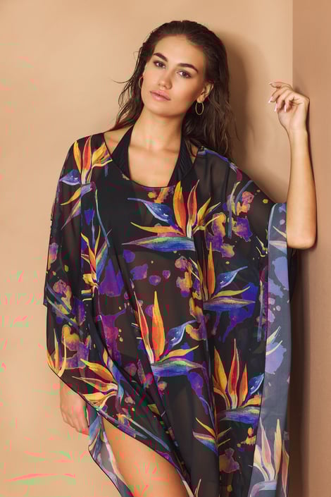 Plážová tunika Padma II v kontrastnej kombinácii čiernej a pestrých tropických kvetov. Vďaka voľnému strihu a ľahkému materiálu sa v nej budete cítiť príjemne aj v letnej horúčave.