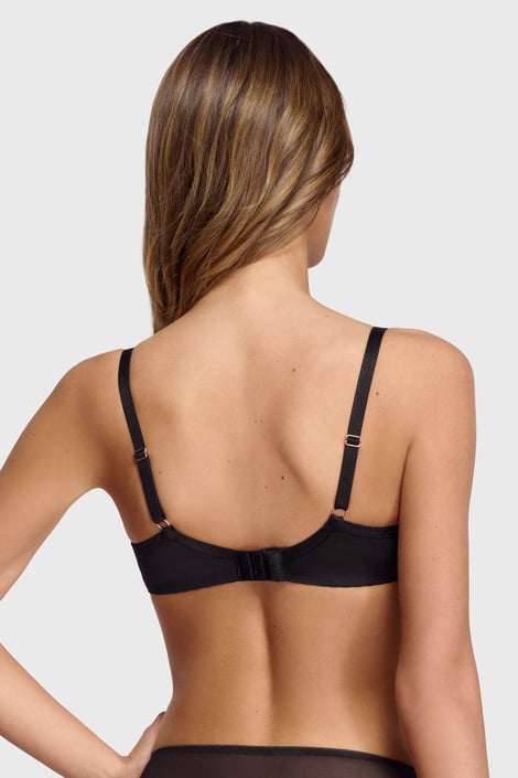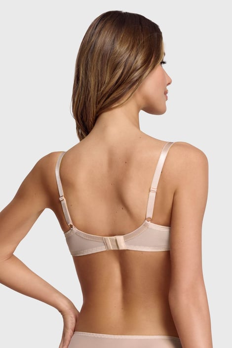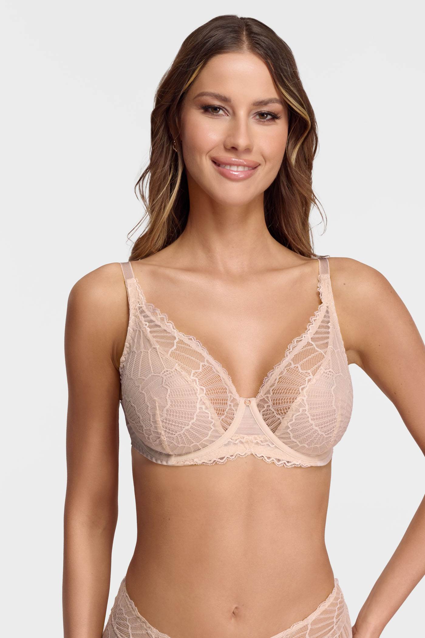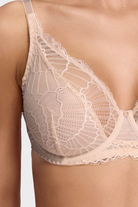 Podprsenka Janiah je stelesnením ženskosti a pohodlia. Čipkované košíčky sú opatrené hlbokými kosticami, ktoré zaistia podporu väčším prsiam a prirodzene tvarujú. Vyšší stred a gumičkou spevnená čipka vo výstrihu spoľahlivo podrží na svojom mieste aj mäkšie prsia. Zadný obvod je z jemnej sieťoviny.