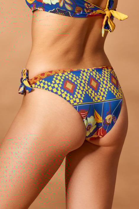 Spodný diel plaviek Vacanze Lampone II v kombinácii pestrofarebného vzoru a trblietavej kamienkovej aplikácie. V obľúbenom klasickom strihu. Na boky môžete uviazať ozdobné šnúrky.